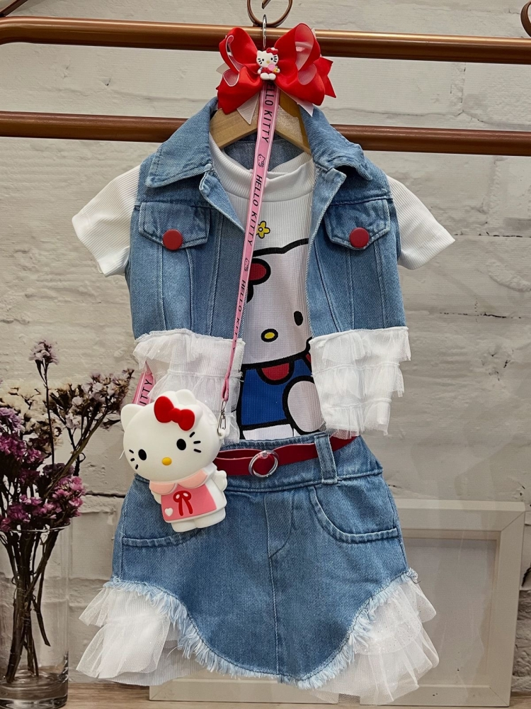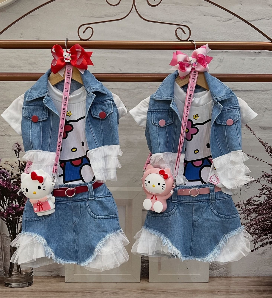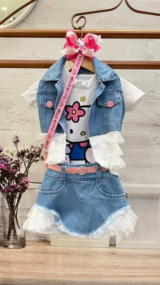 Composto por Blusa Cropped ,saia jeans com babado,cinto e colete jeans